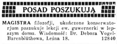 Ogłoszenie pochodzi z lwowskiego pisma "Chwila" 1934, nr 5599 (z 23 października), s. 12.