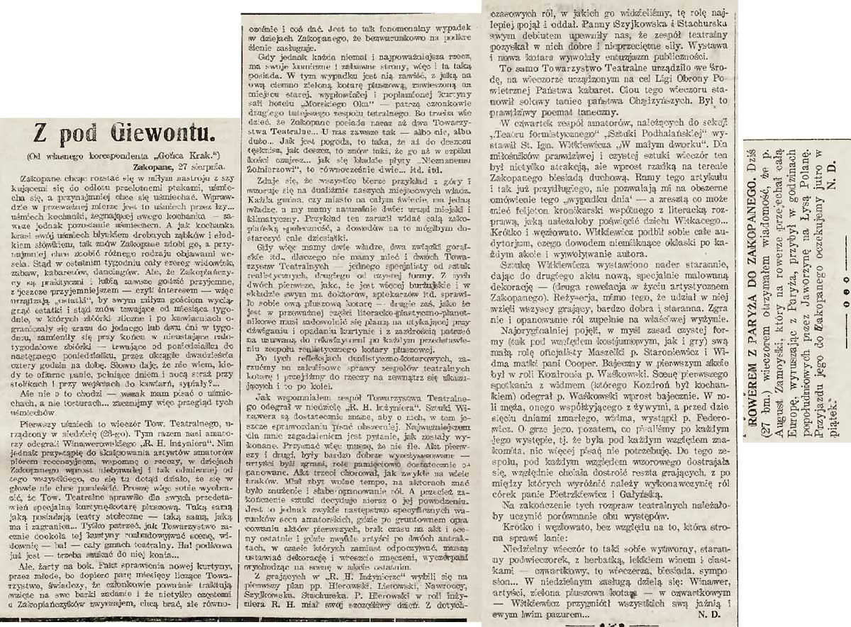 - Jan Brzękowski, Teoria czystej formy. (Uwagi po odczycie St.I. Witkiewicza p.t. "Nieporozumienia teatralne"), "Głos Zakopiański" 1925, nr 29 z 18 lipca, s. 2. Zob. Stanisław Ignacy Witkiewicz, Odpowiedź, "Głos Zakopiański" 1925, nr 30 z 25 lipca, s. 2. (dodał Włodzimierz Mirski)