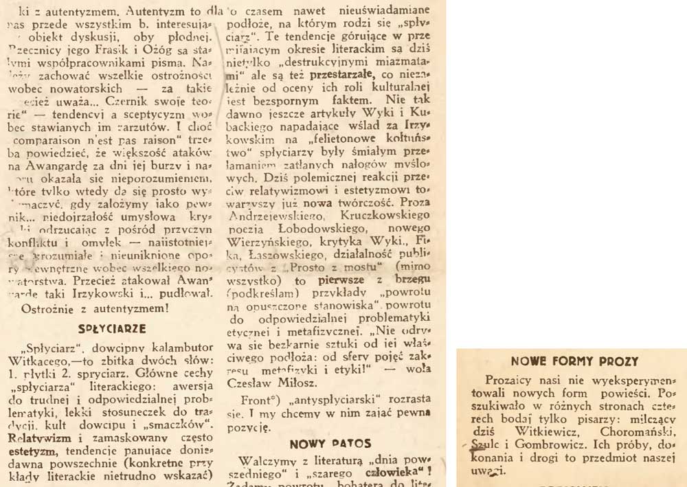 […] SPŁYCIARZE „Spłyciarz”, dowcipny kalambutor Witkacego, —to zbitka dwóch słów: 1. płytki 2. spryciarz. Główne cechy „spłyciarza” literackiego: awersja do trudnej i odpowiedzialnej problematyki, lekki stosuneczek do tradycji. kult dowcipu i „smaczków”. Relatywizm i zamaskowany często estetyzm, tendencje panujące do niedawna powszechnie (konkretne przykłady literackie nietrudno wskazać) i to czasem nawet nieuświadamiane podłoże, na którym rodzi się „spłyciarz". Te tendencje górujące w przemijającym okresie literackim są dziś nie tylko „destrukcynymi miazmatami”, ale są też przestarzałe, co niezależnie od oceny ich roli kulturalnej jest bezspornym faktem. Nie tak dawno jeszcze artykuły Wyki i Kubackiego napadające w ślad za Irzykowskim na „felietonowe kołtuństwo” spłyciarzy były śmiałym przełamaniem zasłanych nałogów myślowych. Dziś polemicznej reakcji przeciw relatywizmowi i estetyzmowi towarzyszy już nowa twórczość. Proza Andrzejewskiego, Kruczkowskiego, poezja Łobodowskiego, nowego Wierzyńskiego, krytyka Wyki, Fika, Łaszowskiego, działalność publicystów z „Prosto z mostu” (mimo wszystko) to pierwsze z brzegu (podkreślam) przykłady „powrotu na opuszczone stanowiska”, powrotu do odpowiedzialnej problematyki etycznej i metafizycznej. „Nie odrywa się bezkarnie sztuki od jej właściwego podłoża: od sfery pojęć zakresu metafizyki i etyki!” — wola Czesław Miłosz. Front*) „antyspłyciarski" rozrasta się. I my chcemy w nim zająć pewną pozycję. […] NOWE FORMY PROZY Prozaicy nasi nie wyeksperymentowali nowych form powieści. Poszukiwało w różnych stronach czterech bodaj tylko pisarzy: milczący dziś Witkiewicz, Choromański, Szulc i Gombrowicz. Ich próby, dokonania i drogi to przedmiot naszej uwagi.