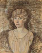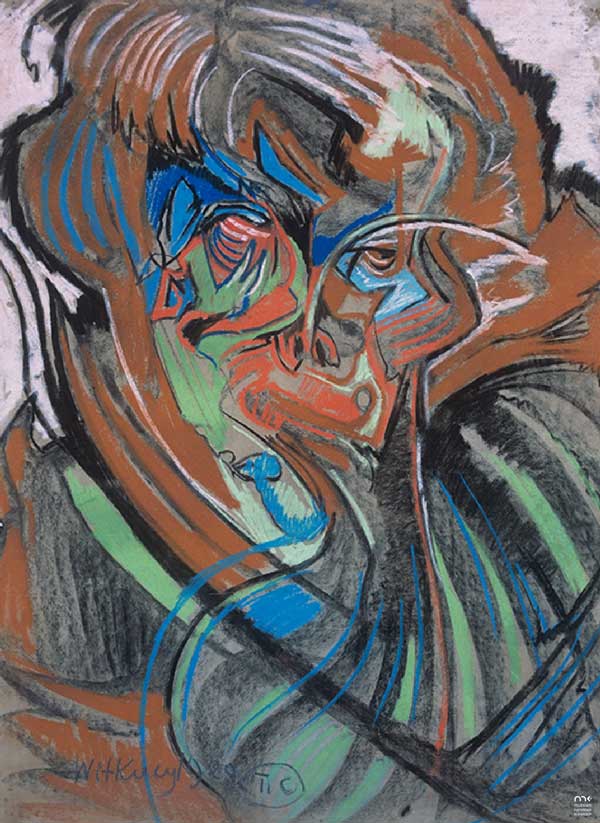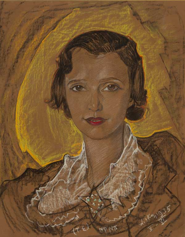 Portret Janiny (Inki ) Turowskiej, od 1933 roku Leszczyńskiej, pastel, papier różowawobeżowy naklejony na tekturę, 66,7 × 49,5 cm, sygn. u dołu po lewej: Witkacy / 1931 2/ VIII / (T.E); u dołu po prawej: NP / + C + [zamazane] Eu / + wóda, KDM I 1491 (dodał Tomasz Pawlak)