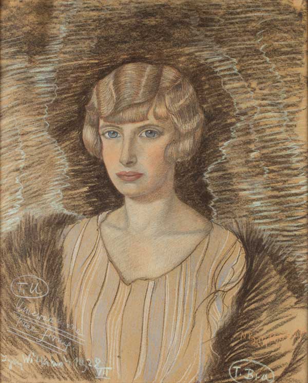 Portret Aleksandry Ustupskiej, 1926, pastel, papier TIZIAN, sygnowany i opisany u dołu: T.B + E / NP1, 2, 3 + 3P / Ign Witkiewicz 1926 [datowanie słabo widoczne], w KDM I 667 jako "Portret dziewczyny".
