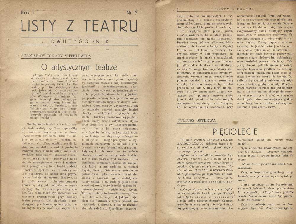 - S.I. Witkiewicz, O artystycznym teatrze, "Listy z teatru", dwutygodnik, Rok 1, nr 7, Kraków 1946.