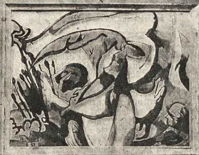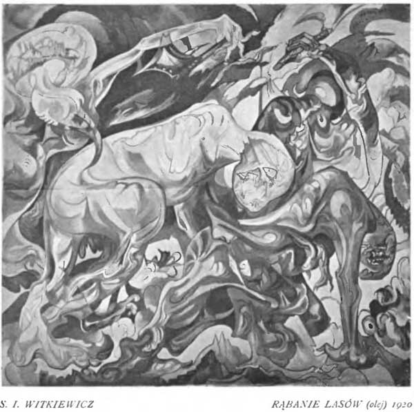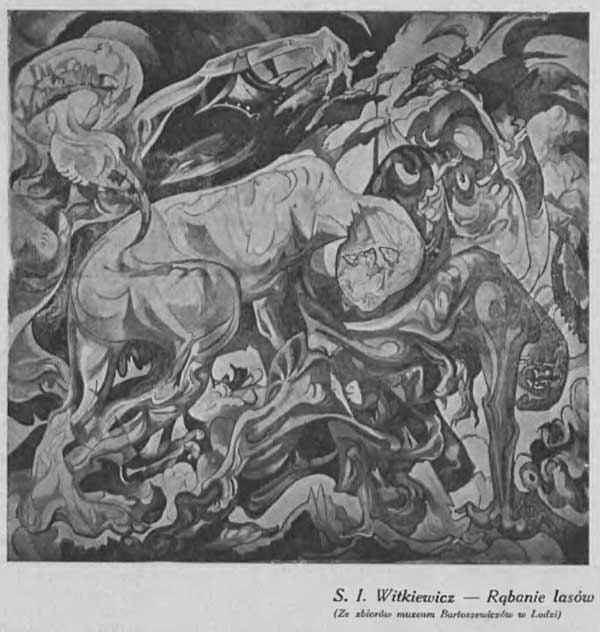 Reprodukcja także w: "Wymiary" 1938, numer 4 z września, s. 1, S.I. Witkiewicz - Rąbanie lasów (ze zbiorów muzeum Bartoszewiczów w Łodzi) (nie odnotowana w KDM). Także w "Wymiary 1938, numer 6 z listopada, rozkładówka na s. 148-149: Miejskie Muzeum Historii i Sztuki im. Juliana i Kazimierza Bartoszewiczów w Łodzi, Fragment sali formizmu z rzeźbami Z. Pronaszki. Obraz Witkacego w głębi. (dodał Tomasz Pawlak)