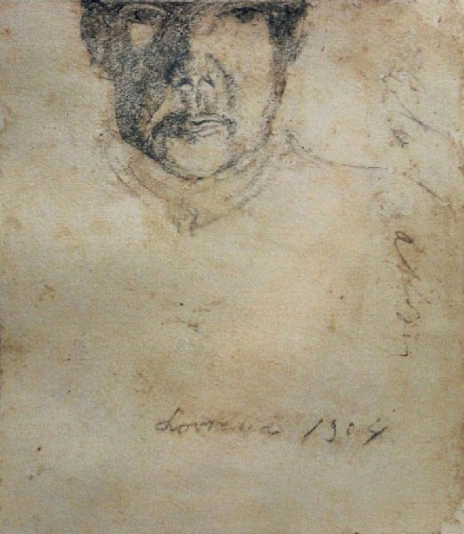 - Szkic portretowy głowy mężczyzny, ołówek i czarna kredka, („do góty nogami” w stosunku do awersu), obcięty powyżej oczu; u dołu napis: Lovrana 1904; po prawej bokiem częściowo zatarty napis: Dla [...?]. Rysunek na odwrocie projektu ekslibrisu z 1920. 101 Projekt Galeria Sztuki Współczesnej Aukcja Sztuki Współczesnej, 27 września 2017. Katalog aukcji (dodał Stefan Okołowicz)