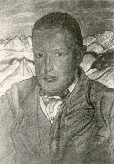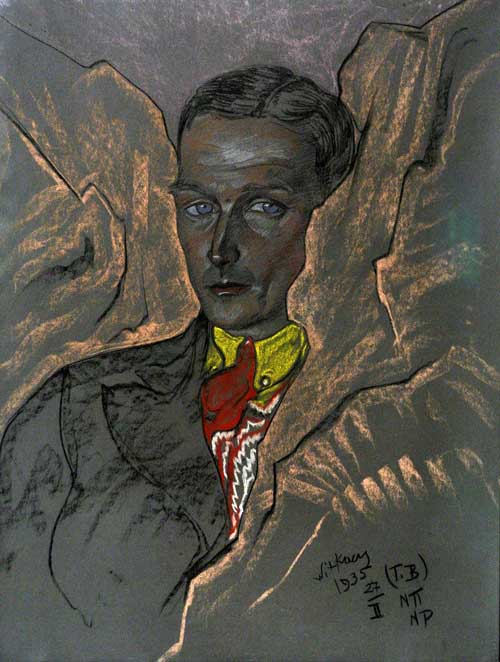 - Portret młodego mężczyzny na tle gór, 1935 pas., pap. szary 64x50; sygn. p.d.: Witkacy /1935 / 27 / II (T.B) NP / NΠ.MNP, KDM 1909, il. 488 (fot. Adam Drogomirecki)
