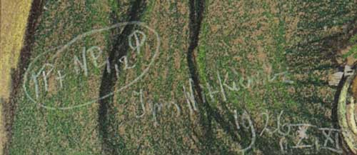 G.R: Prawdopodobnie są to inicjały osoby obecnej przy wykonaniu pracy – identyczne znajdują się, m.in. na portrecie Augusta Zamoyskiego z 15 X 1918 roku (zbiory Muzeum Pomorza Środkowego w Słupsku) - wg ekspertyzy Anny Żakiewicz. AgraArt, Aukcja sztuki dawnej, 16.6.2019 (dodał Tomasz Pawlak)