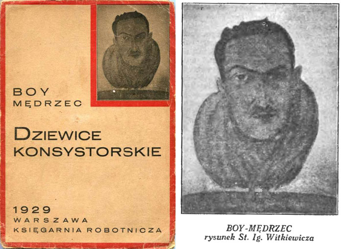 - Boy-Żeleński, Boy-Mędrzec, T.E. Witkacy 1928 XI NΠ 5 m + Cof, KDM nr 891, reprodukowany w: Boy o "dziewicach konsystorskich", "Wiadomości Literackie" 1929, nr 7 z 17 lutego, s. 5, oraz na okładce: Tadeusz-Żeleński (Boy), Dziewice konsystorskie, Warszawa 1929. Księgarnia Robotnicza (dodali Włodzimierz Mirski i Wojciech Sztaba)