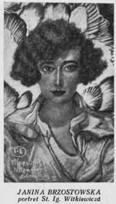 - Portret Janiny Brzostowskiej, II 1929 T.E… w: U poetów (recenzja tomu poezji Brzostowskiej), "Wiadomości Literackie" 1929, nr 22 z 2 czerwca, s. 3. KDM I 913. O rysowaniu portretu Witkacy pisał z Zakopanego do żony 13 II.1929 (Ldż nr 301) (dodał Włodzimierz Mirski). Portret w kolorze, zbiory prywatne.