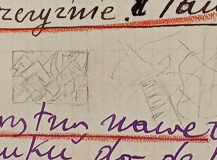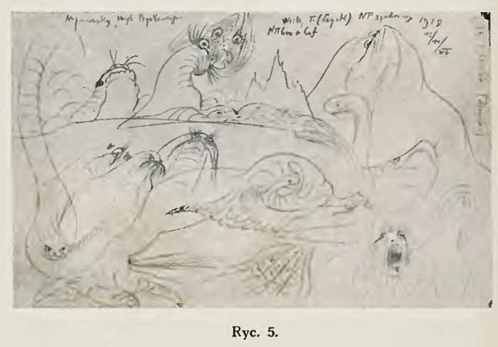 - Rysunek "po peyotlu", sygn. Witkacy 1928 / 10/XII NΠ 6m 1/2 NP / po peyotlu rano, repr. w: Stefan Szuman, O wizjach fantastycznych po zażyciu peyotlu, „Tęcza” 1930, nr 8 (22 II), s. 11. (dodał Przemysław Pawlak).