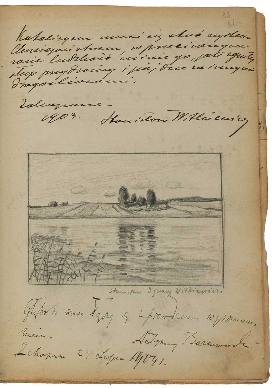 - Pejzaż zimowy z rzeką, 1906, olej, płyta, 40,5 x 29,5 cm, sygn. p.d.: St. Ignacy Witkiewicz, na odwrocie autorska dedykacja: Pani Felicji za wszystkie spełnione i niespełnione jeszcze winy ofiarowuje na przeproszenie St.I.W. 1906 luty. Nie wymieniony w KDM. POLSWISS ART, Aukcja Dzieł Sztuki, 11.12.2018 (dodał Wojciech Sztaba)