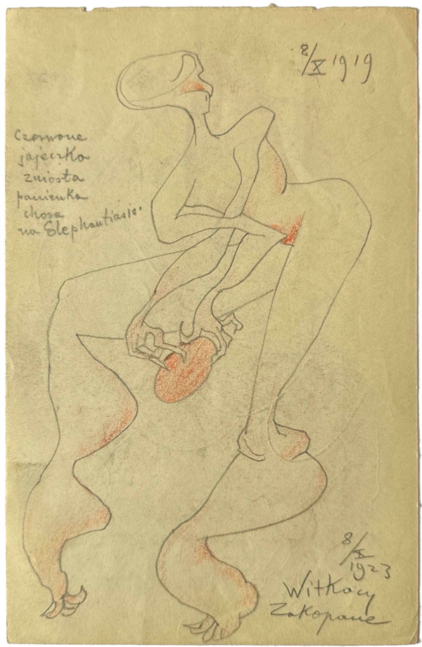 - Metafizyczny rozporek wszechświata, rysunek sygn. u góry pośrodku: Witkacy T.C. (po peyotlu 5 dni) / 1928 VI / Metafizyczny rozporek / wszechświata / sztucznie /ograniczonego. Po prawej dedykacja: Dla Zosi Mikuckiej specjalnie do ntej potęgi. Aukcja Dzieł Sztuki Agraart, 18.3.2018 (dodał Marek Średniawa)