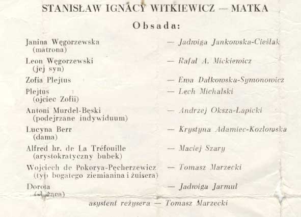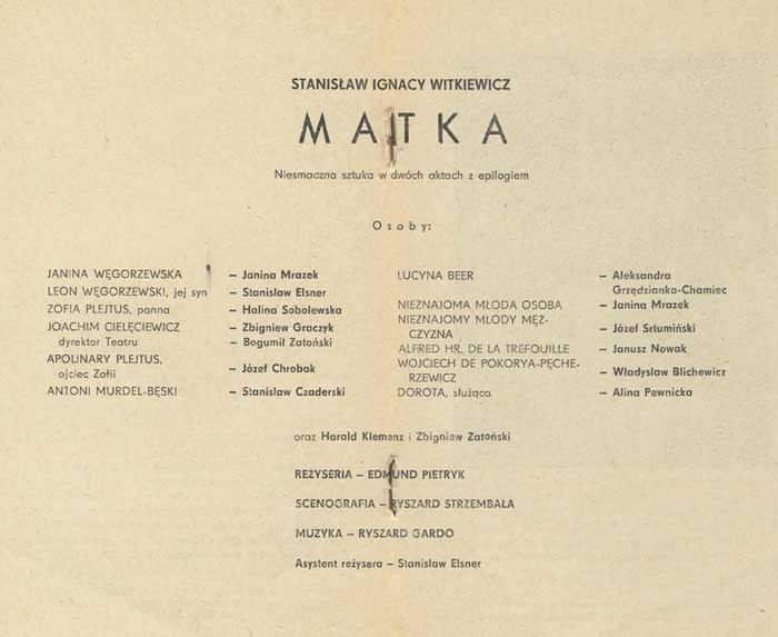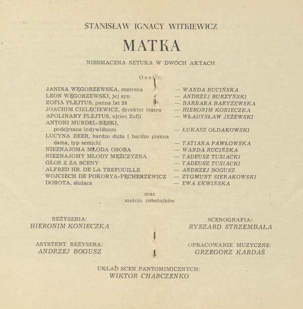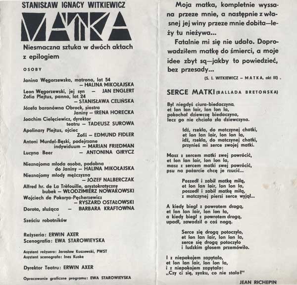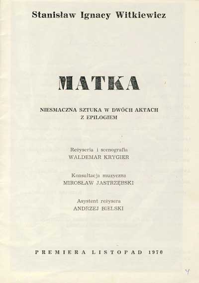 W programie: Janusz Degler, Mała kronika życia i twórczości Stanisława Ignacego Witkiewicza; Janusz Degler, Witkacego teoria teatru; Daniel Gerould, Wprowadzenie do "Matki" (przekład Ewa Siemińska-Degler); Genezyp Kapen (Stanisław Ignacy Witkiewicz), O dandyzmie zakopiańskim (podał do druku i opracował J. Degler)