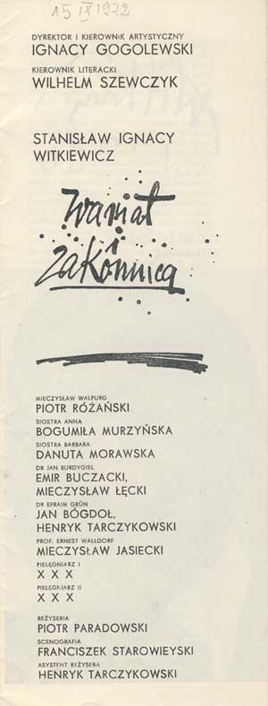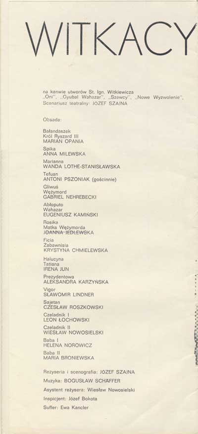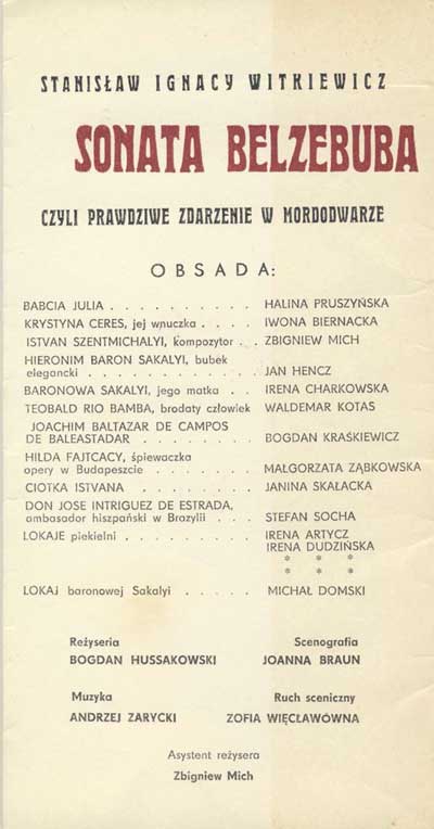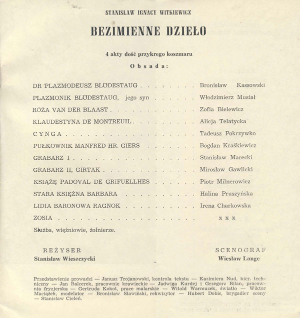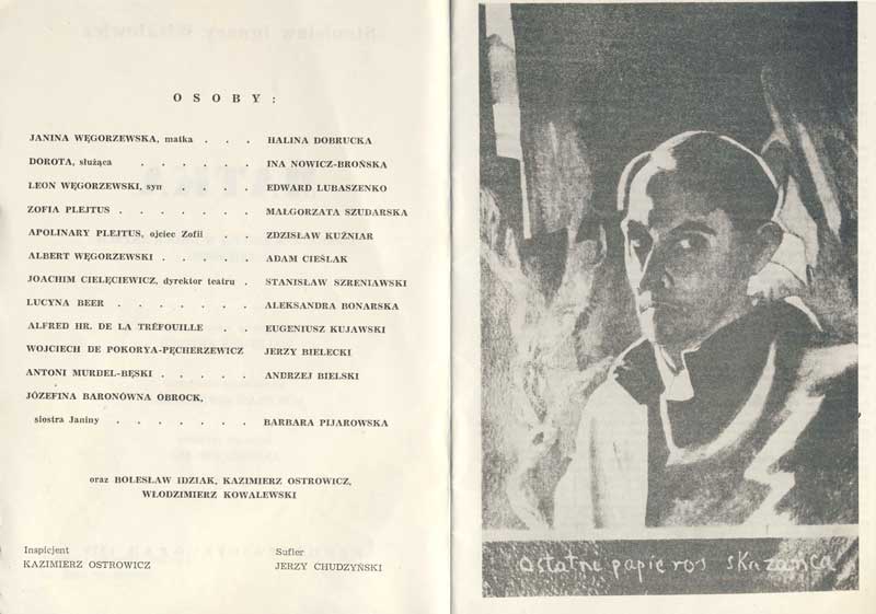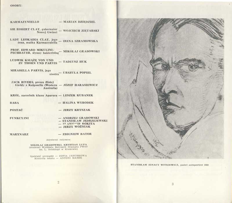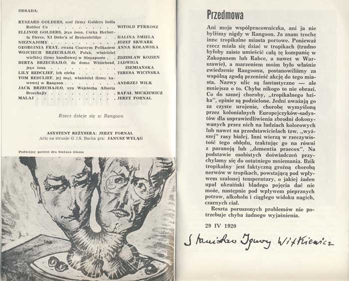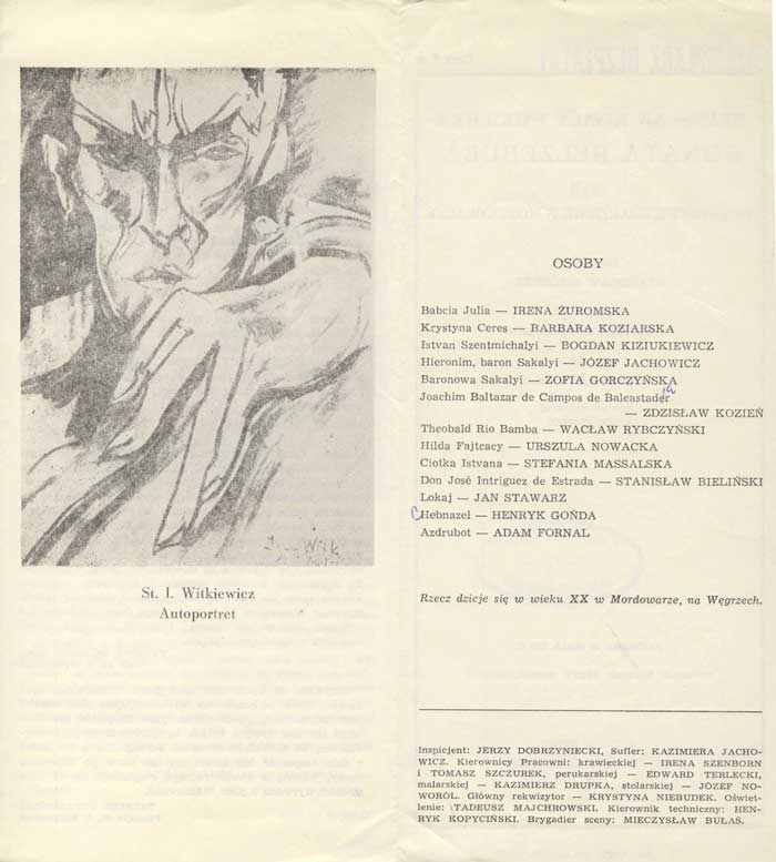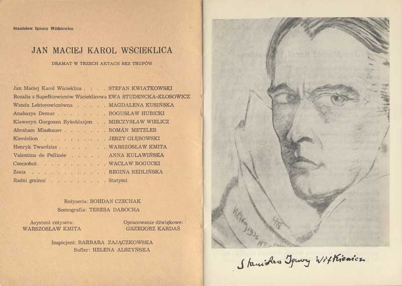 W programie: S. Marczak-Oborski, Stanisław Ignacy Witkiewicz, W. Boratyński, Notatki na marginesie egzemplarza; K. Puzyna, Na przełęczach bezsensu; M. Król, Polska w twórczości S. I. Witkiewicza