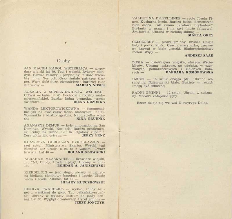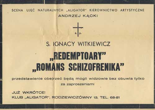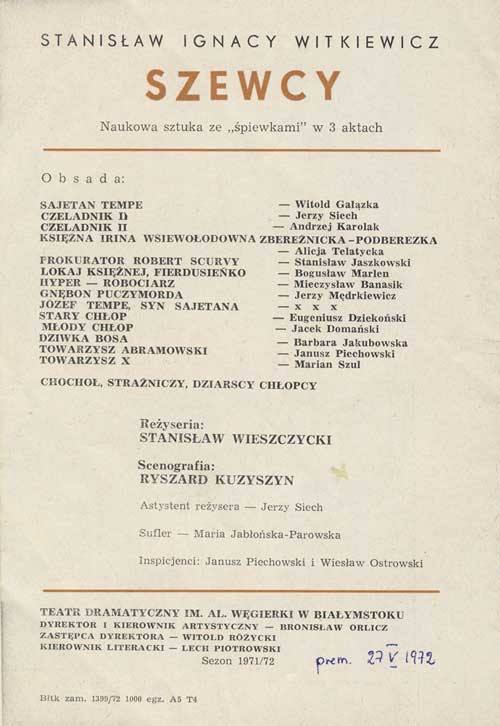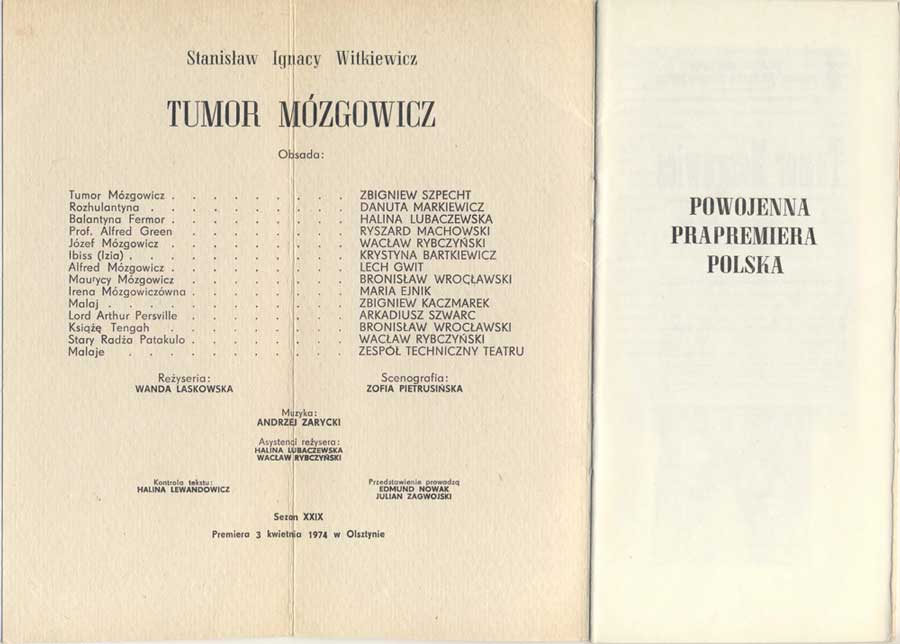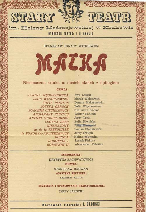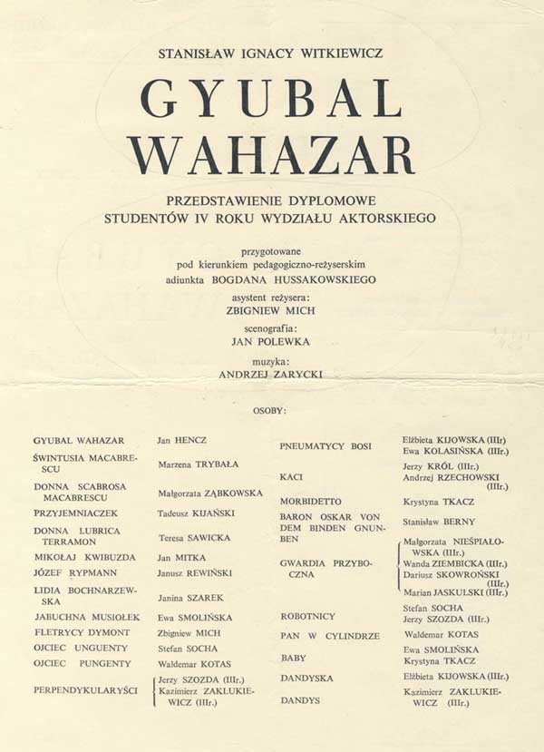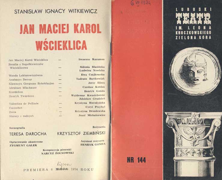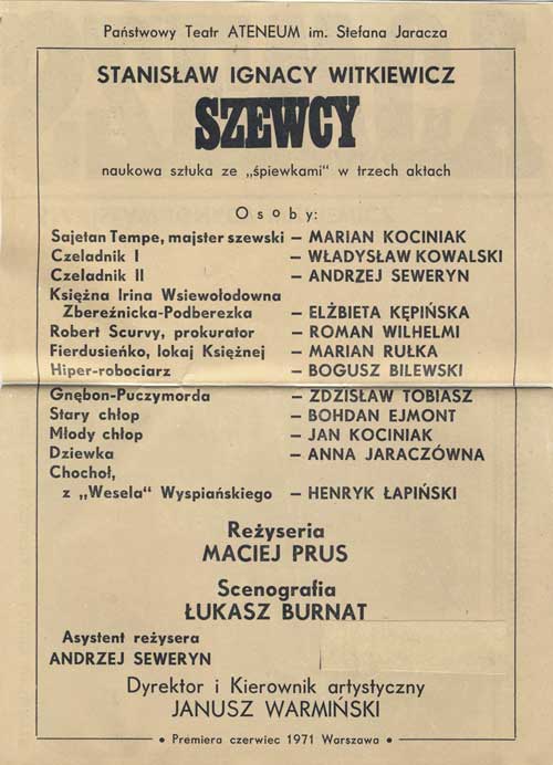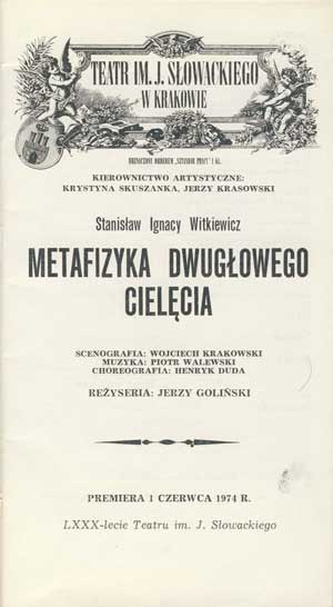W programie: S. Marczak-Oborski, Stanisław Ignacy Witkiewicz, W. Boratyński, Notatki na marginesie egzemplarza; K. Puzyna, Na przełęczach bezsensu; M. Król, Polska w twórczości S. I. Witkiewicza
