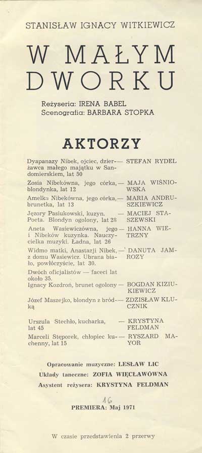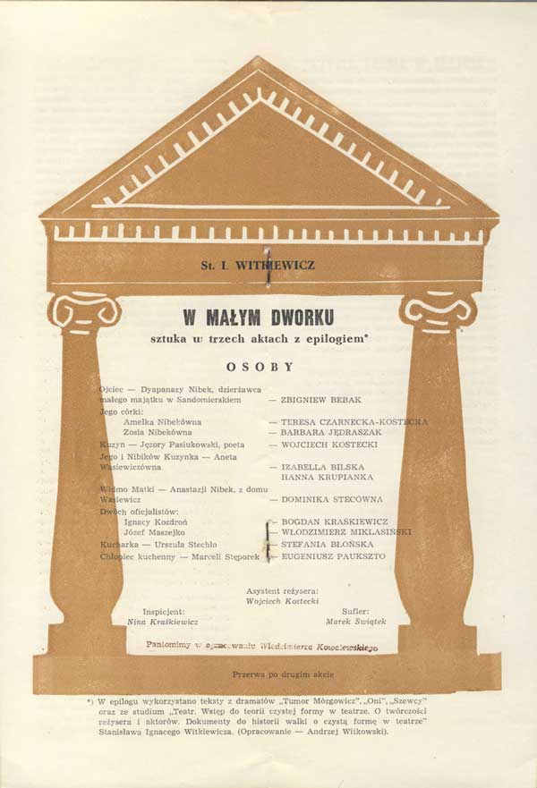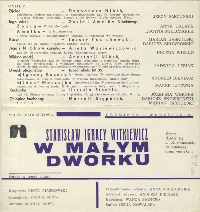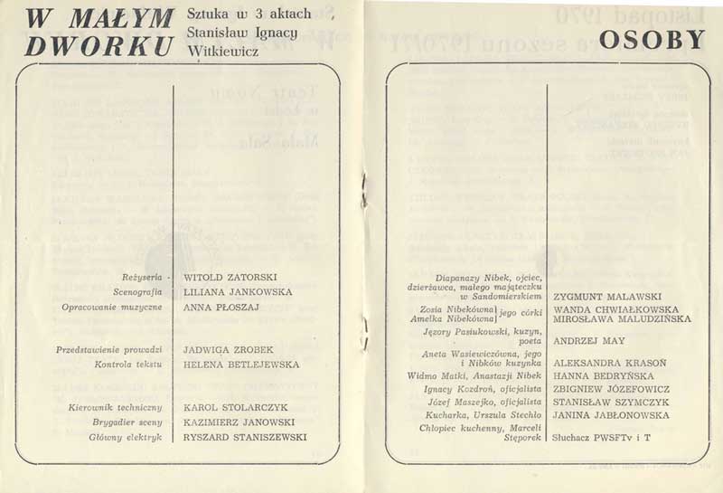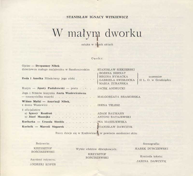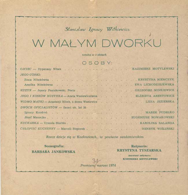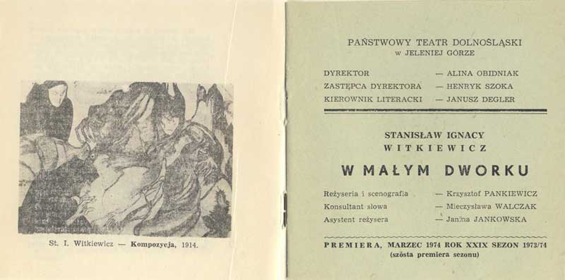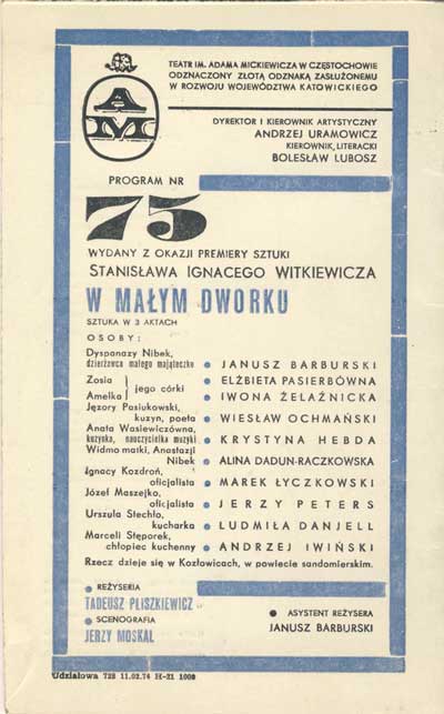 W programie: Jan Błoński, O teatrze Witkacego; Janusz Degler, Dzieje sceniczne "W małym dworku". |