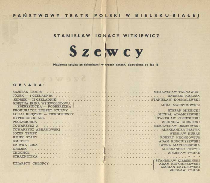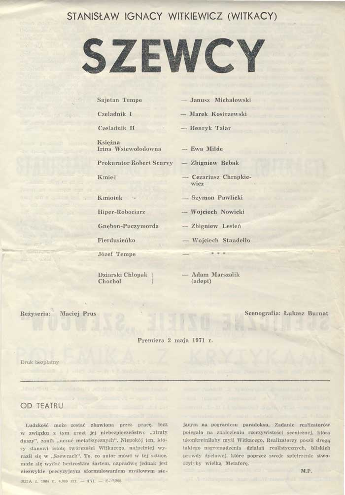 W programie: J. Kłossowicz, Z zagadnień filozofii, estetyki i katastrofizmu Witkacego; K. Puzyna, O "Szewcach"; S. Szuman, Problem nudy i nienasycenia w dramacie "Szewcy"