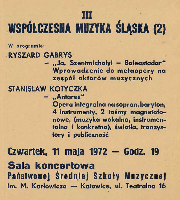 W programie: fragmenty tekstów J. Deglera, J. Błońskiego, B. Micińskiego, T. Boya-Żeleńskiego, K. Puzyny, T. Kotarbińskiego, T. Kudlińskiego; A. Falkiewicz, Witkacy, Artaud, Awangarda; J. Kurek, Przeciwko teorii teatru S. I Witkiewicza