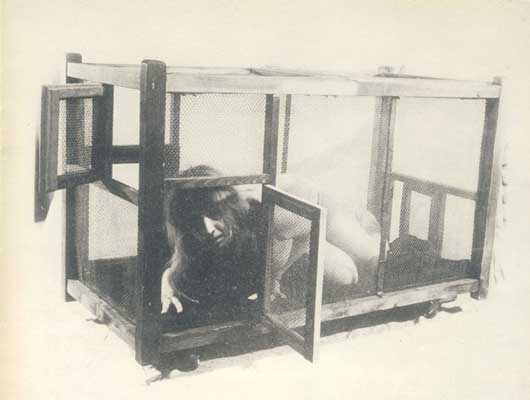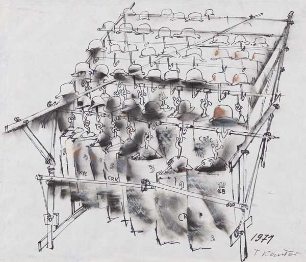 Tadeusz Kantor, "Szatnia", do spektaklu Teatru Cricot 2 "Nadobnisie i koczkodany", 1971, tusz, gwasz, pisak/papier, 29,6 x 35,2 cm.