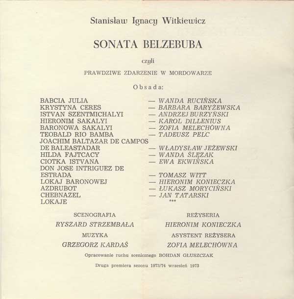 W programie: Sądy o Witkacym {kilkanaście krótkich fragmentów tekstów różnych autorów]; Karol Irzykowski [recenzja wydania Sonaty Belzebuba]